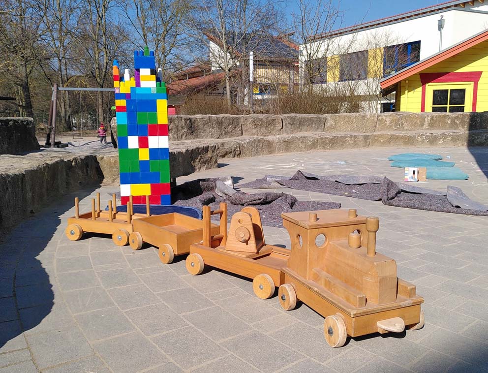 Das hatten wir noch nie. Eine Holzeisenbahn der Kita Zwergenhaus in Stadecken-Elsheim mit Lokomotive und 3 Waggons:
